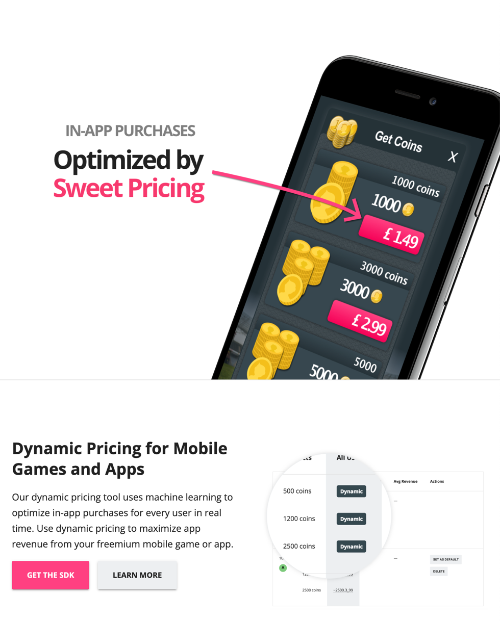 Sweet Pricing is an innovative dynamic pricing tool for mobile games and apps. Sweet Pricing created one of the first dynamic pricing SDKs for in-app purchases, serving over 80 mobile apps on Google Play and the App Store.